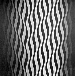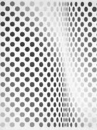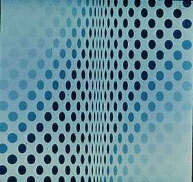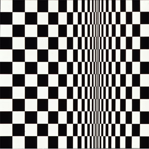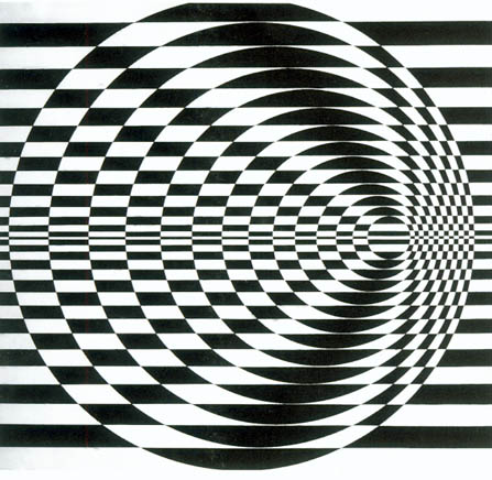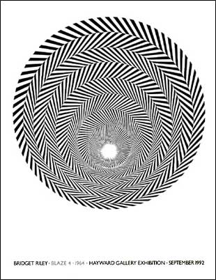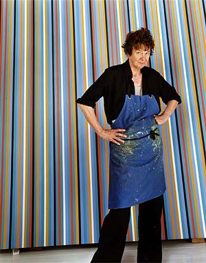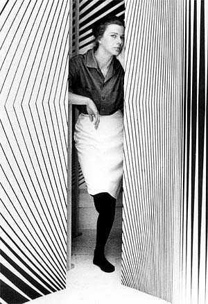 Riley with her work: left: with her sculpture 'Continuum'' by Lord Snowdon in 1964. right: ''Après-Midi'' (1981) oil on linen, 91" x 77 3/4", photographed in 1982. See this for more information about Riley.